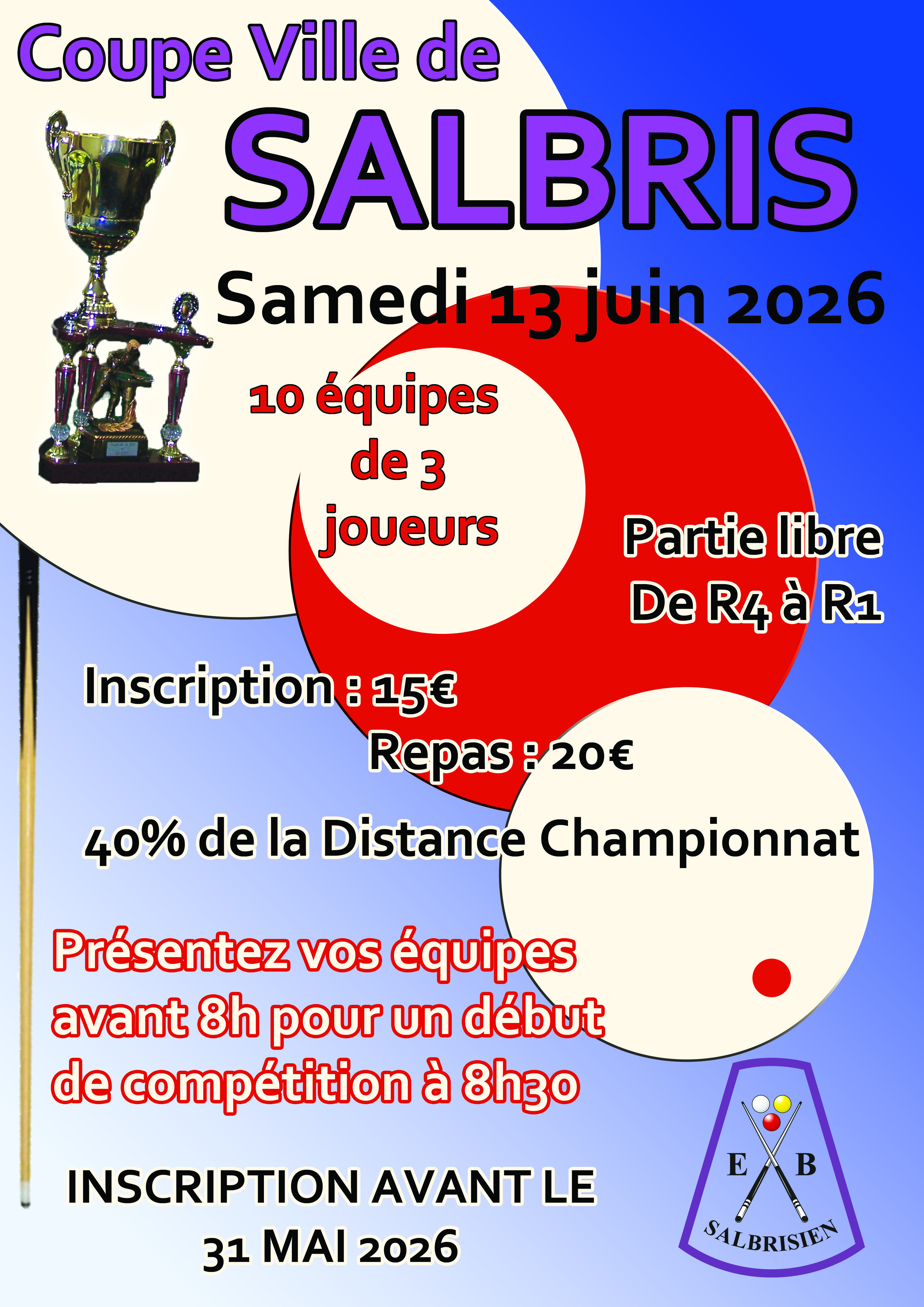 L'Entente Billard Salbrisien organise son traditionnel tournoi de la ville à la libre le Samedi 13 juin 2026.