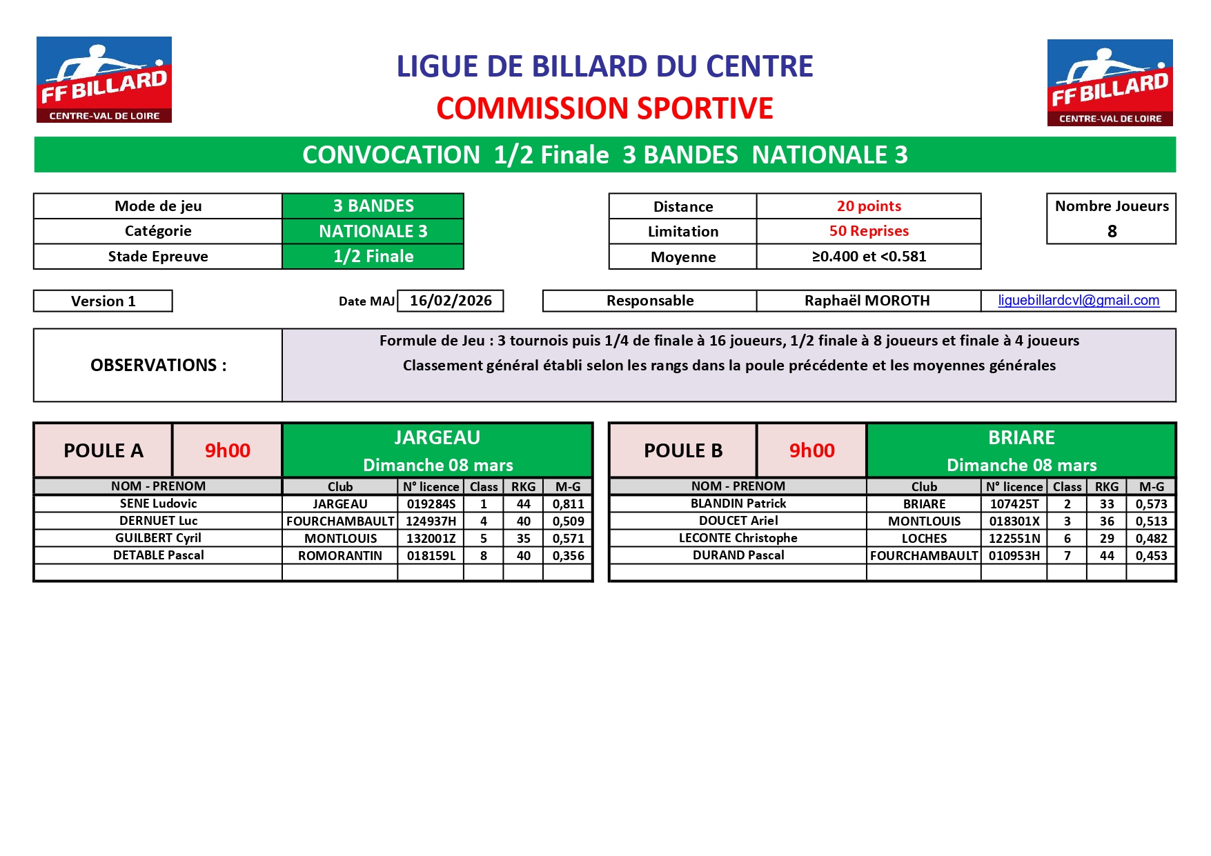 Veuillez trouver ci-joint la convocation de la 1/2 Finale 3 Bandes N3 du 08 mars 2026.|