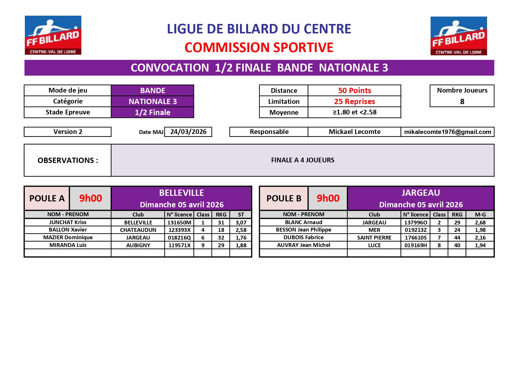 Veuillez trouver ci-joint la convocation pour les 1/2 Finale 1 Bande N3 du 05 Avril 2026.|