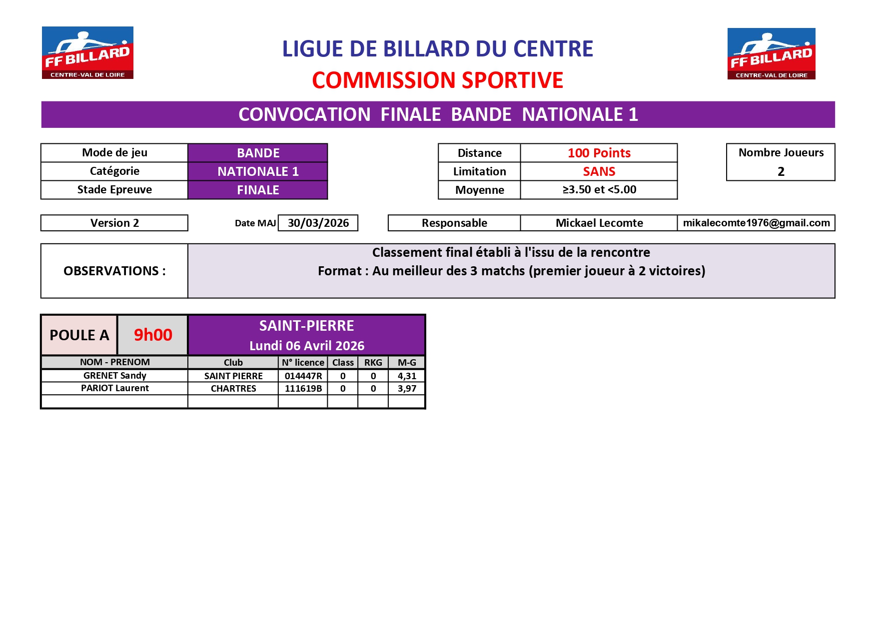 Veuillez trouver ci-joint la convocation du T1 1 Bande N1 du 06 avril 2026. Format : Au meilleur des 3 matchs (premier joueur à 2 victoires)/. Classement final établi à l'issu de la rencontre.