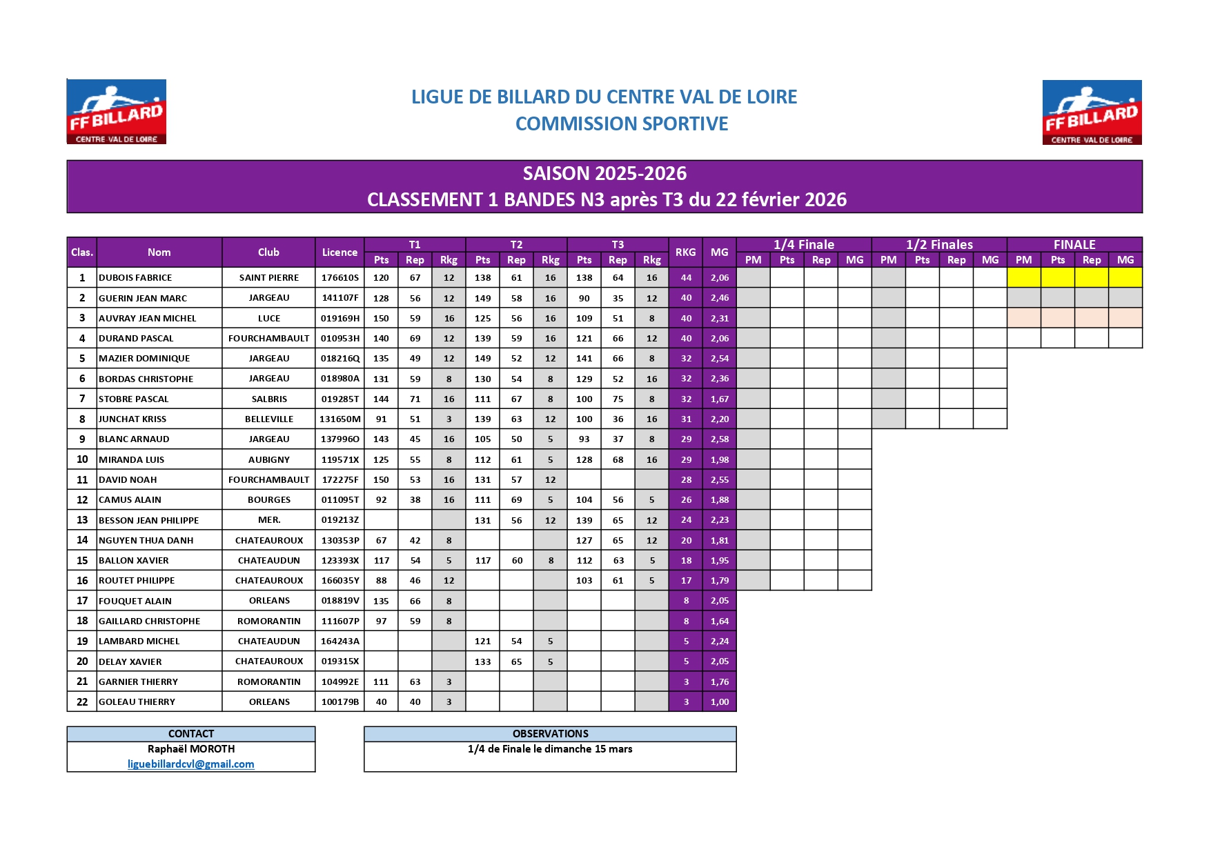 Classement 1 Bande N3 après T3Fabrice Dubois (St Pierre) prend la tête du classement après le T3 Bande N3 avec une moyenne générale de 2,06.