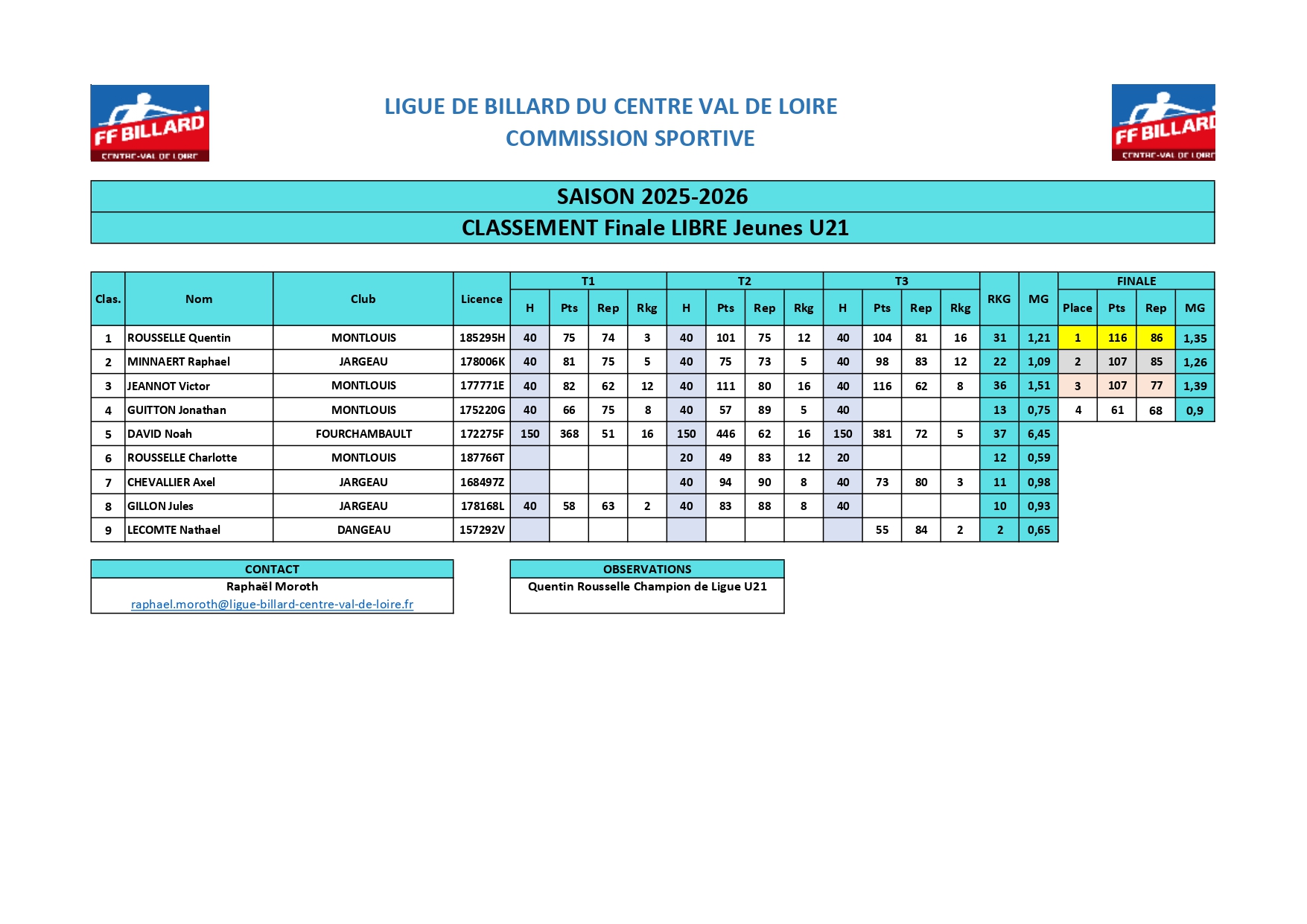 Quentin Rousselle (Montlouis) remporte la finale Libre U21 avec une moyenne de 1,35. Il devance Raphaël Minnaert (Jargeau, MG 1,26) et Victor Jeannot (Montlouis, MG 1,39)