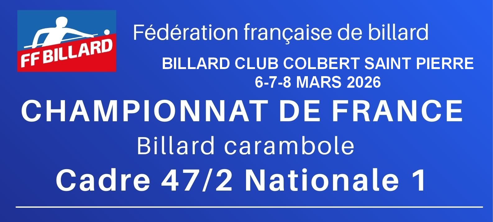 Le BC Colbert St Pierre des Corps est heureux d’accueillir la Finale de France du Cadre 47/2 Nationale 1 ce weekend du 6 au 8 mars 2026.