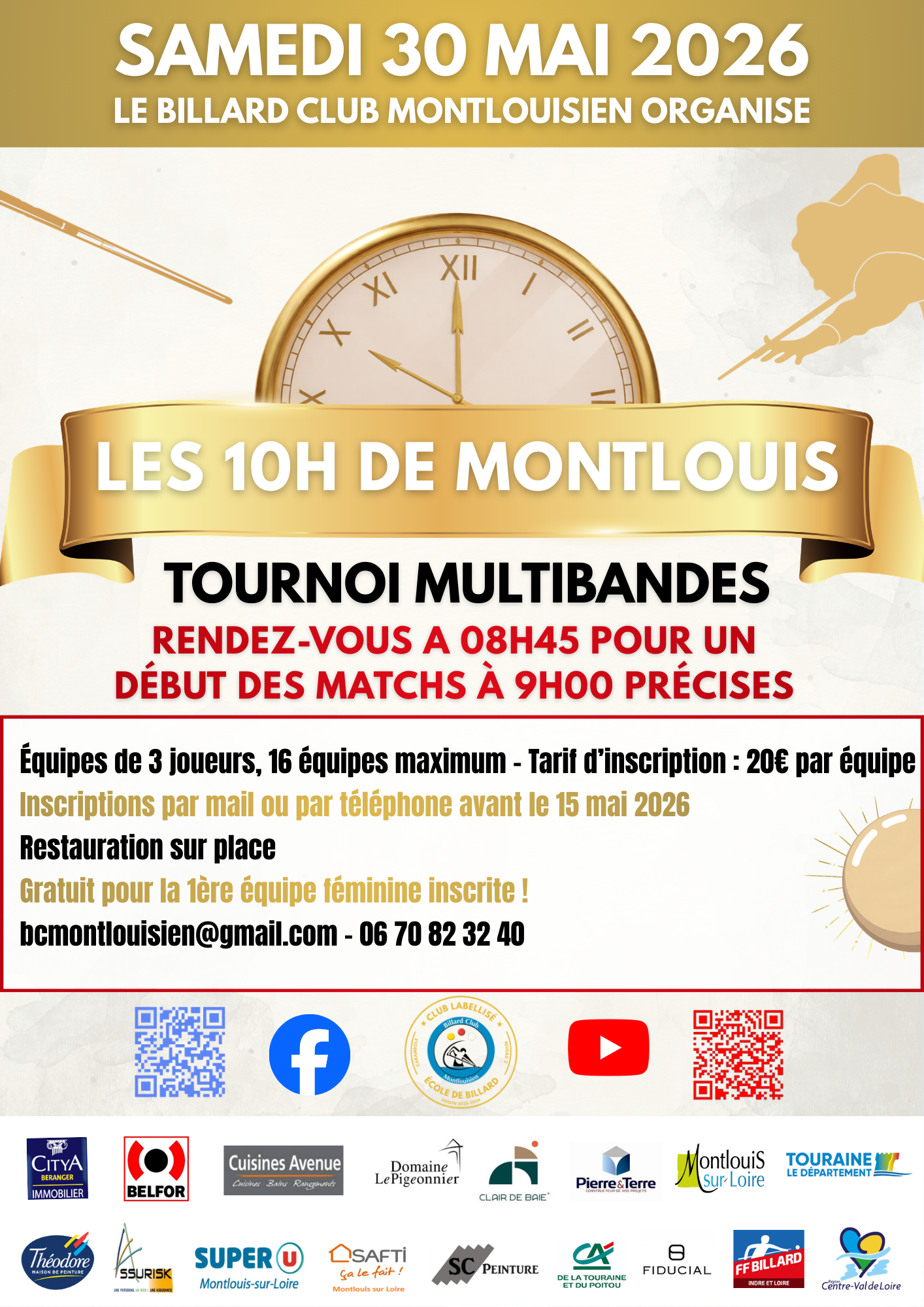 Le Billard Club Montlouisien organise son traditionnel tournoi des 10 heures le samedi 30 mai (règlement ci-dessous).