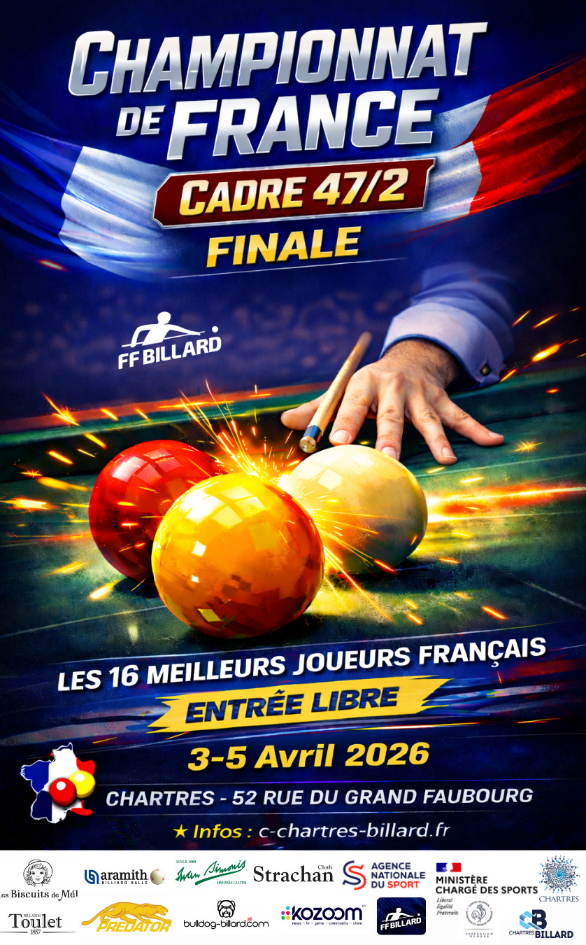 - Le Championnat de France Masters 47/2 qui regroupera les 16 meilleurs joueurs français du 03 au 05 avril. Pour l'occasion, le club a prévu tribunes et restauration sur place. L'intégralité de la compétition sera diffusée sur la chaîne Youtube du club : https://www.NotAllowedScript69cf9ab511371youtube.com/@cchartresbillard/streams.