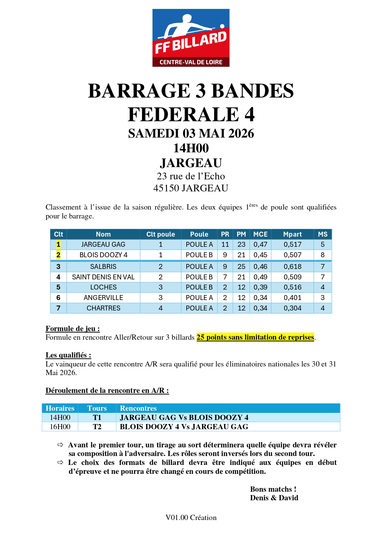 Veuillez trouver ci-joint la convocation du barrage 3 Bandes Fédérale 4 du 03 mai 2026