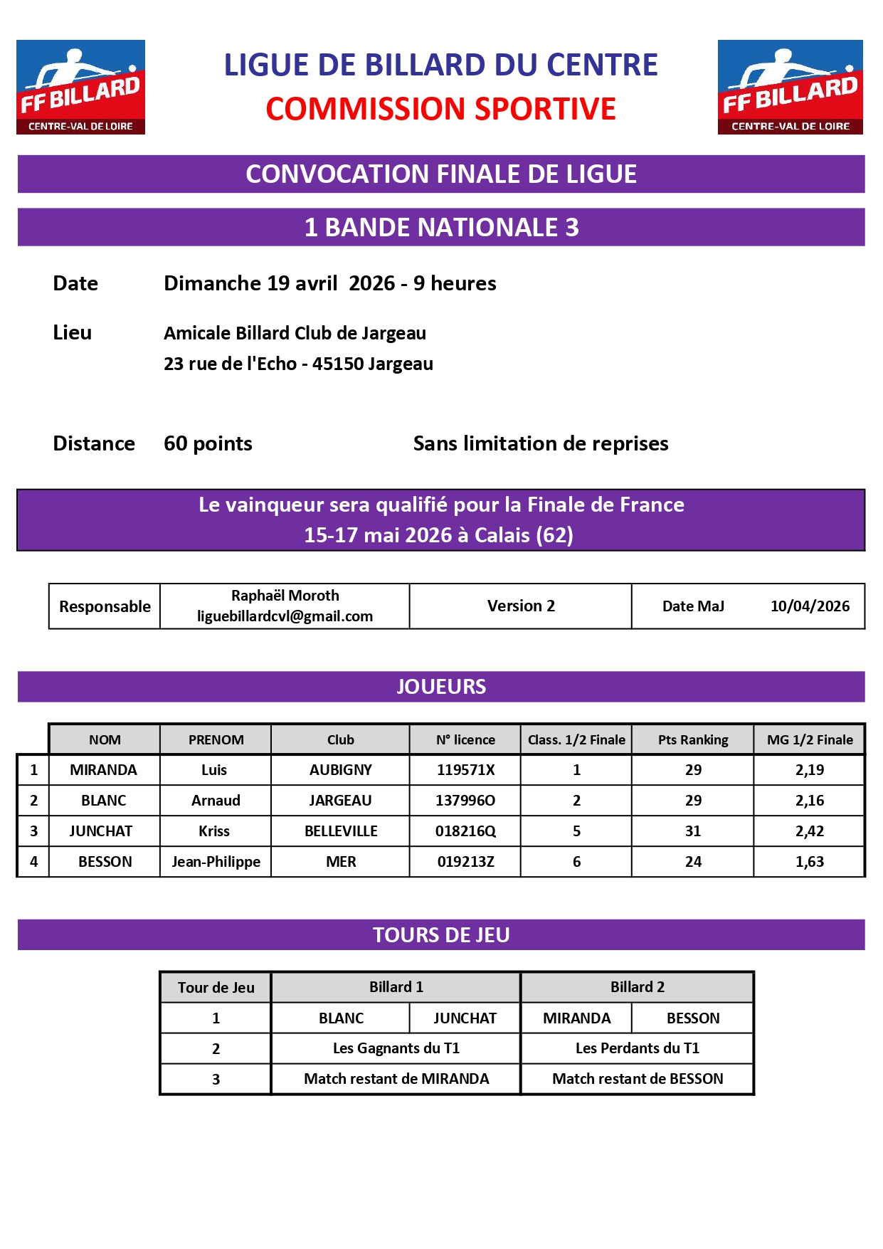 Veuillez trouver ci-joint la convocation pour la Finale 1 Bande N3 du 19 Avril 2026.Version 2 : Retrait de F.Dubois et entrée de J-P. Besson.