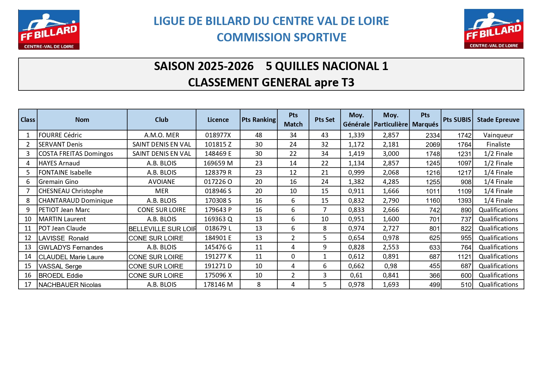 Cédric Fourre (Mer) reste en tête du classement général du 5 Quilles N1 après le T3. Il devance Denis Servant (Saint Denis en Val) et Domingos Costa Freitas (Saint Denis en Val)