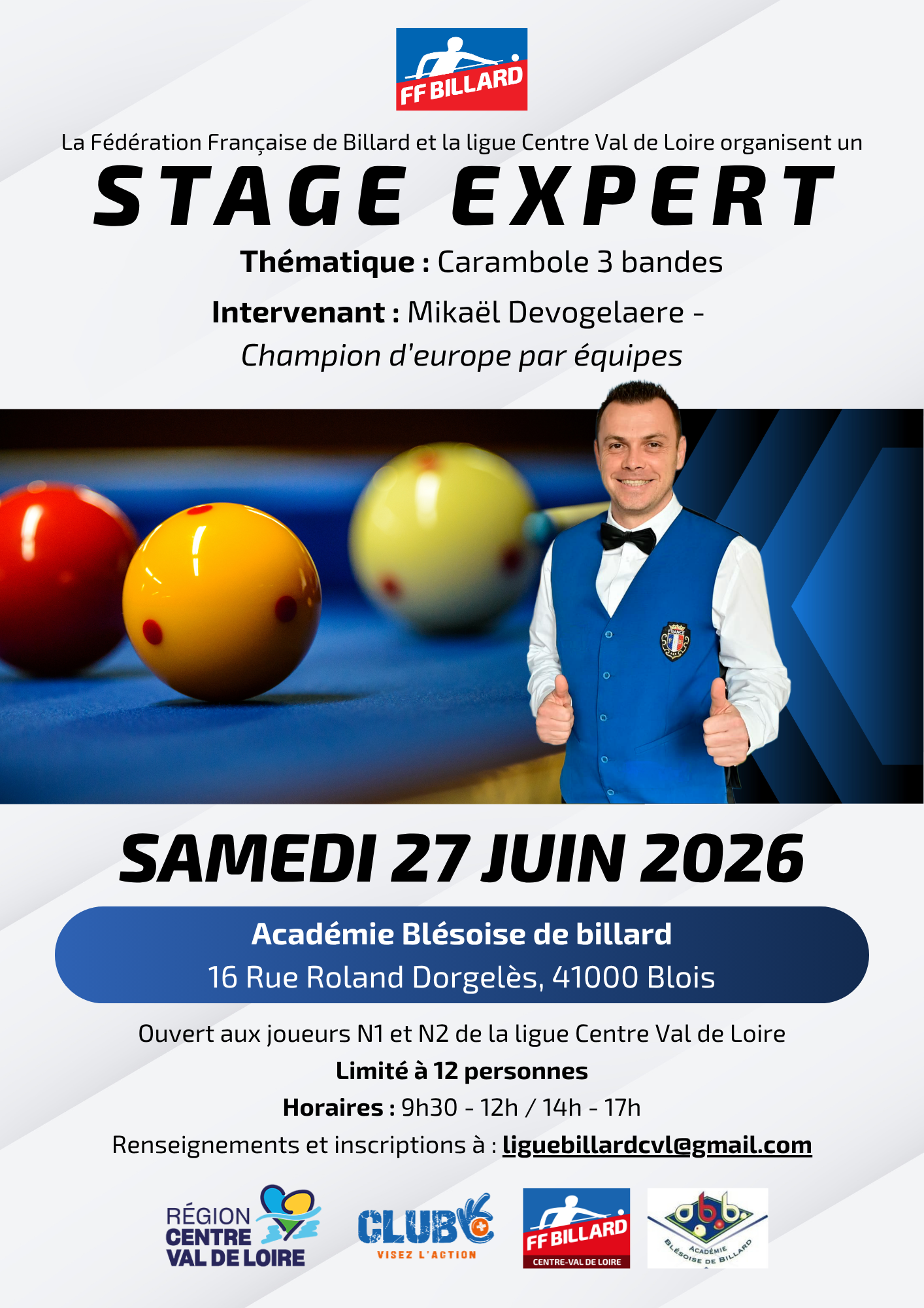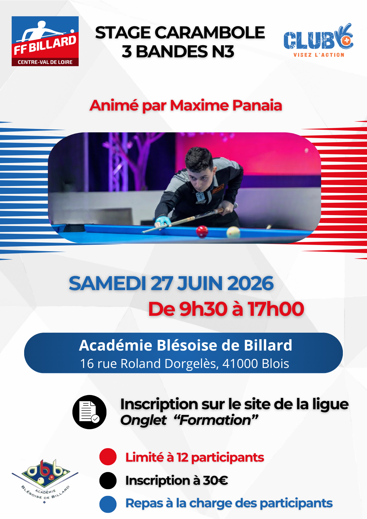 Lieu : Académie Blésoise de Billard 9h30 à 17h00